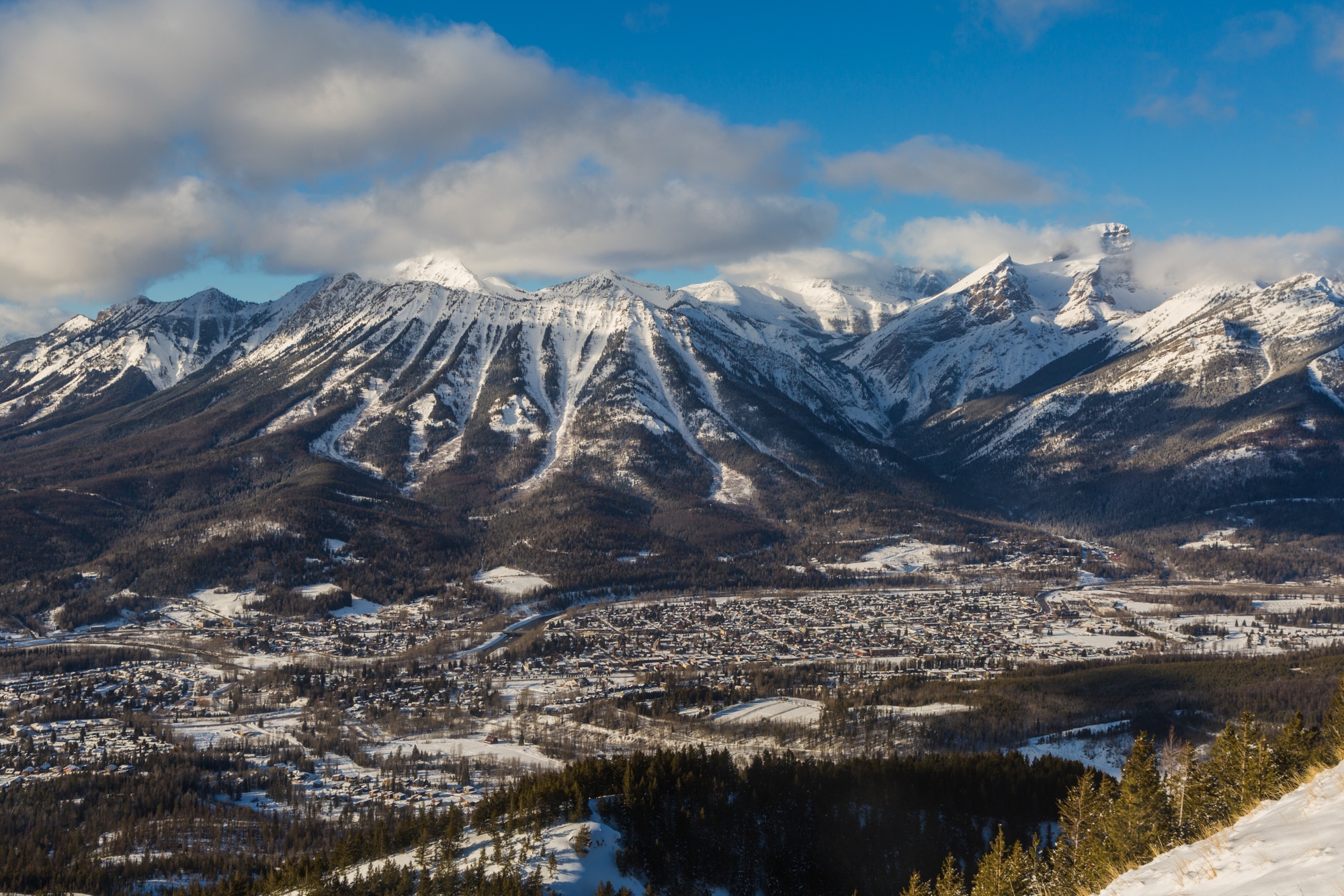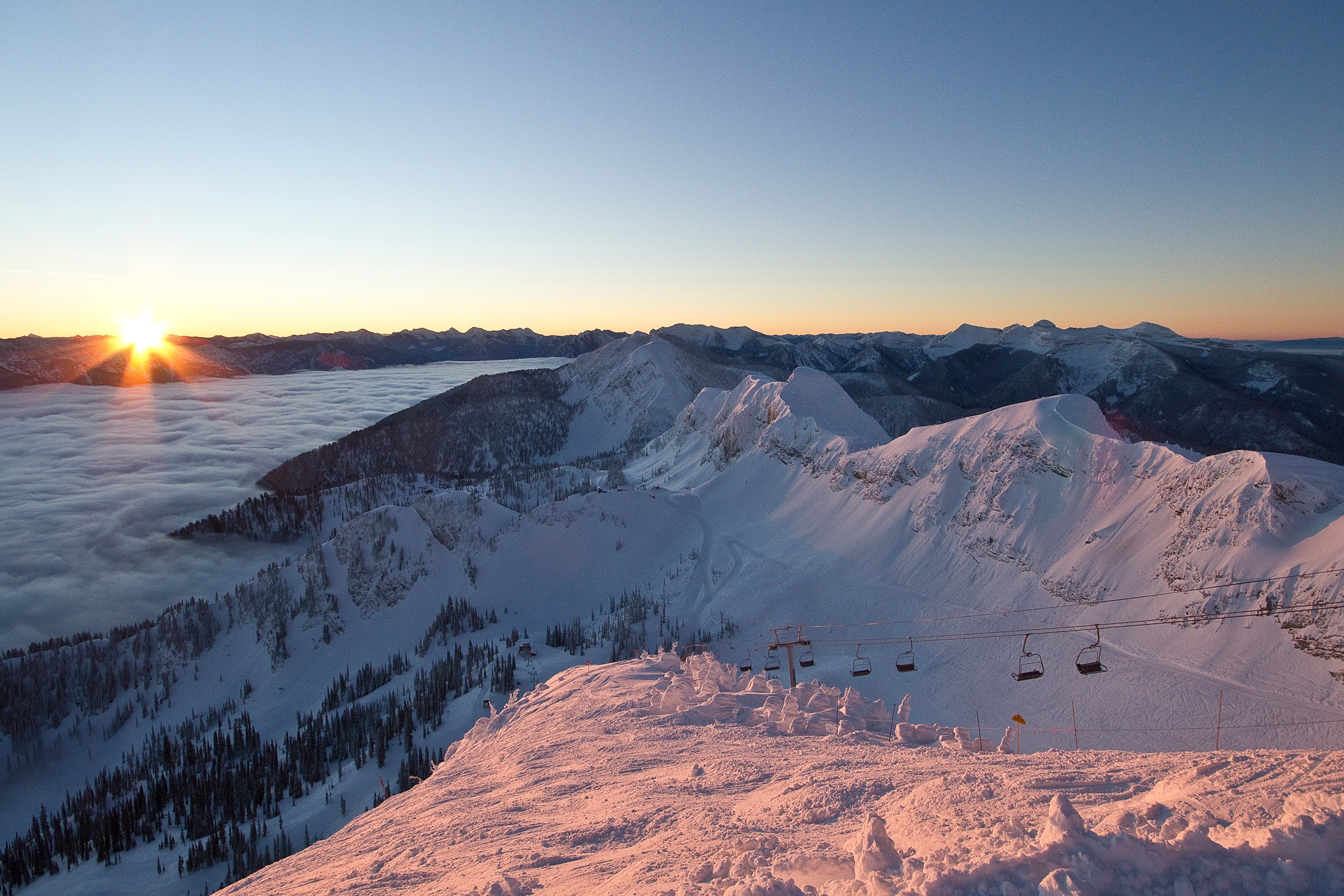 Ride the Timber Bowl Express Quad at Fernie Alpine Resort. From the Lost Boys Cafe you can pick up a hot drink and watch the Sun's early morning rays kiss the town in the valley below as it rises over Fernie Ridge.